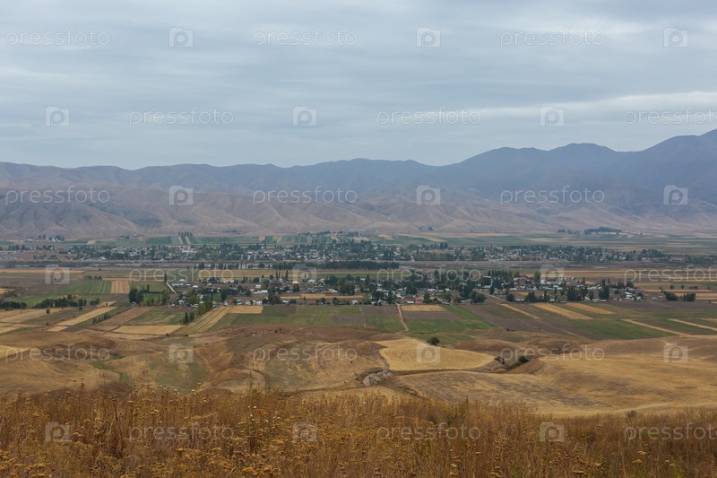 Вид на деревню Шабдан у гор Тянь-Шаня, Кыргызстан