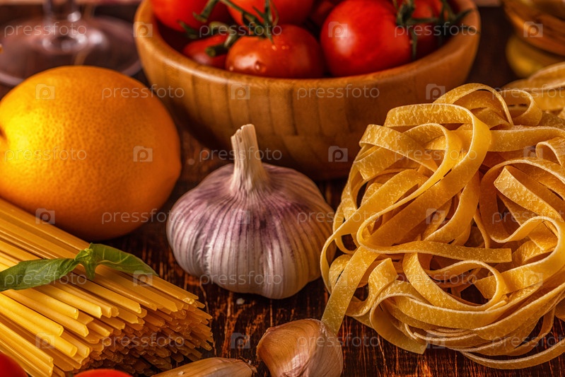 Продукты для приготовления пищи - макароны, помидоры, чеснок, оливковое масло и красное вино