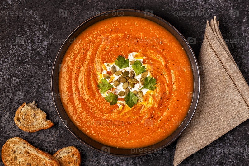 Тыквенно-морковный суп со сливками, семечками и петрушкой
