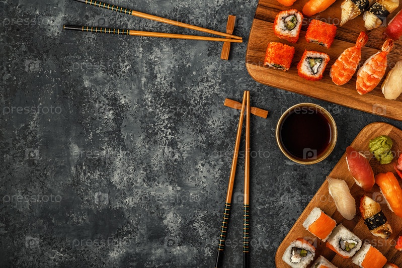 Суши-сет: суши и суши-роллы на деревянной тарелке
