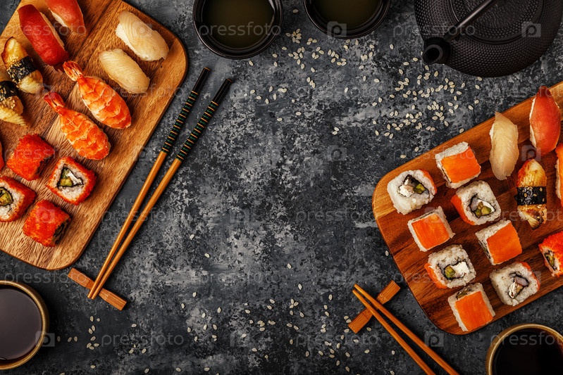 Суши-сет: суши и суши-роллы на деревянной тарелке