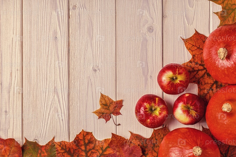 Осенний фон с цветными листьями и тыквами на деревянном фоне