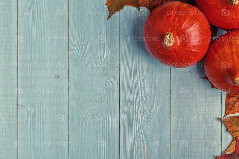 Осенний фон с цветными листьями и тыквами на деревянном фоне