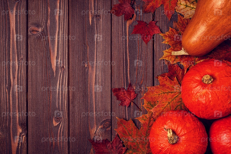 Осенний фон с цветными листьями и тыквами на деревянном фоне