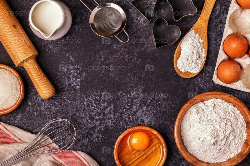Ингредиенты для выпечки - мука, деревянная ложка, скалка, яйца