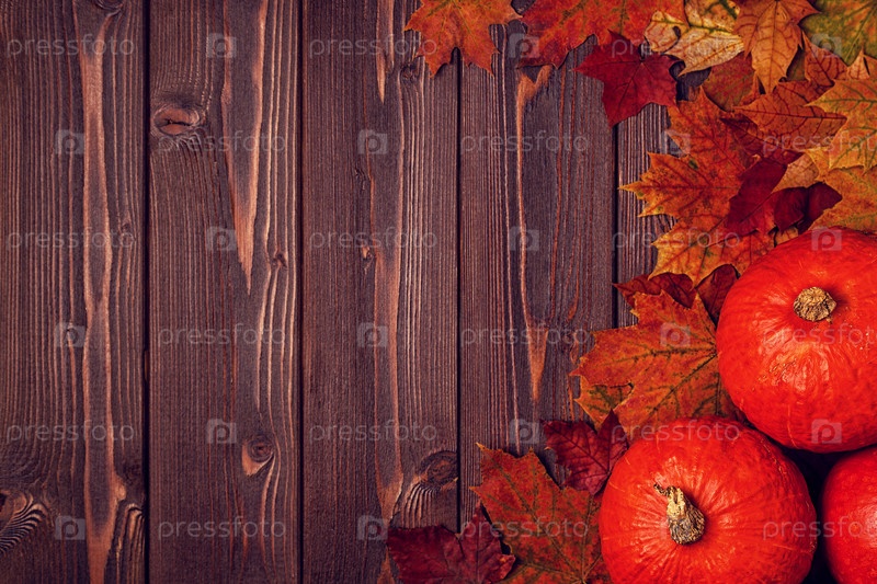 Осенний фон с цветными листьями и тыквами на деревянном фоне