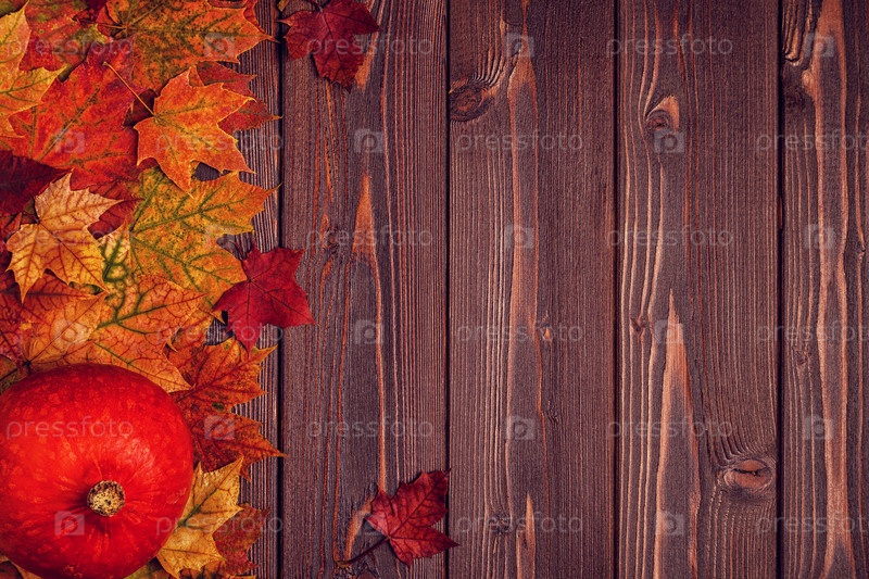 Осенний фон с цветными листьями и тыквами на деревянном фоне