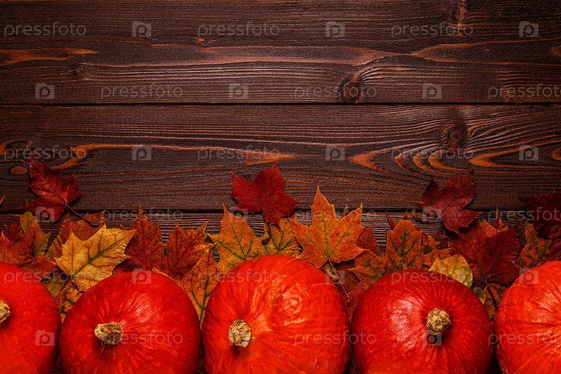 Осенний фон с цветными листьями и тыквами на деревянном фоне