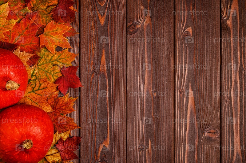 Осенний фон с цветными листьями и тыквами на деревянном фоне