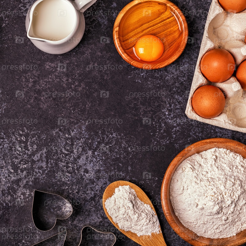 Ингредиенты для выпечки - мука, деревянная ложка, скалка, яйца