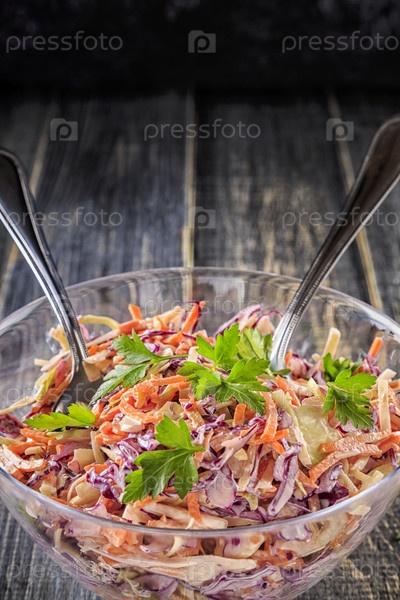 Домашний салат из капусты в миске на темном деревянном фоне