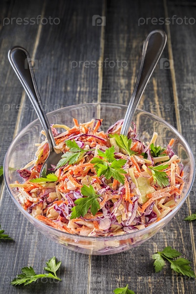 Домашний салат из капусты в миске на темном деревянном фоне