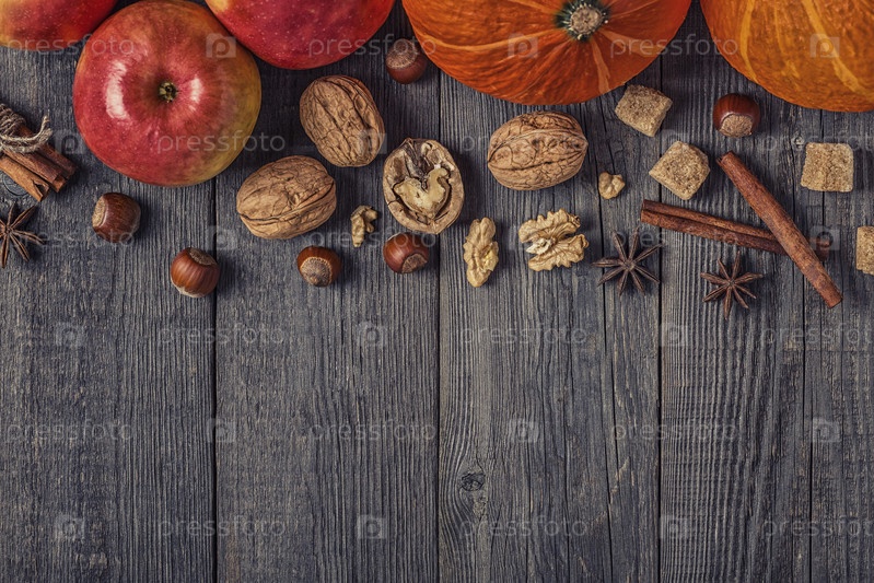 Деревянный фон с тыквой, яблоками, орехами и специями
