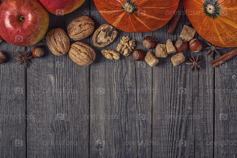 Деревянный фон с тыквой, яблоками, орехами и специями