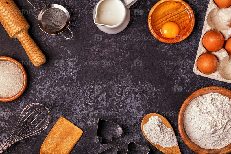 Ингредиенты для выпечки - мука, деревянная ложка, скалка, яйца