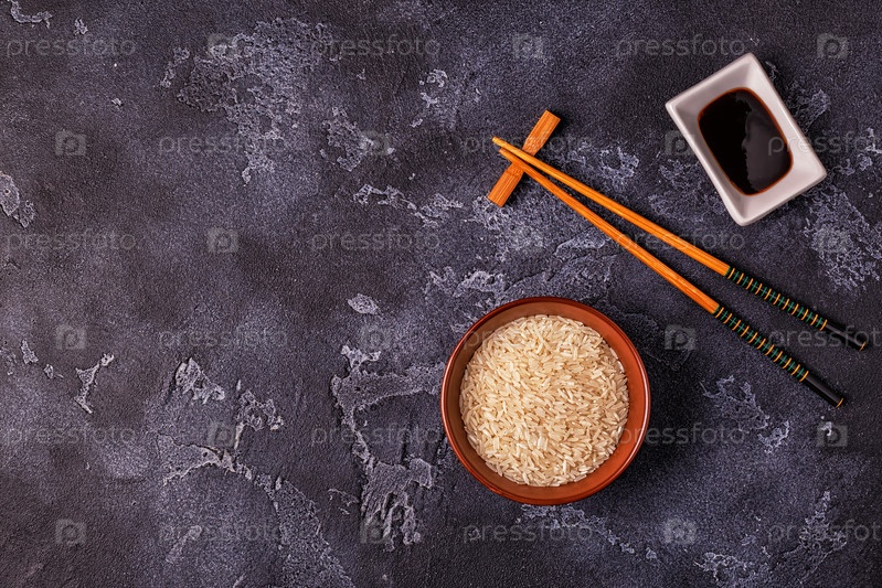 Рис в миске и деревянные палочки для еды