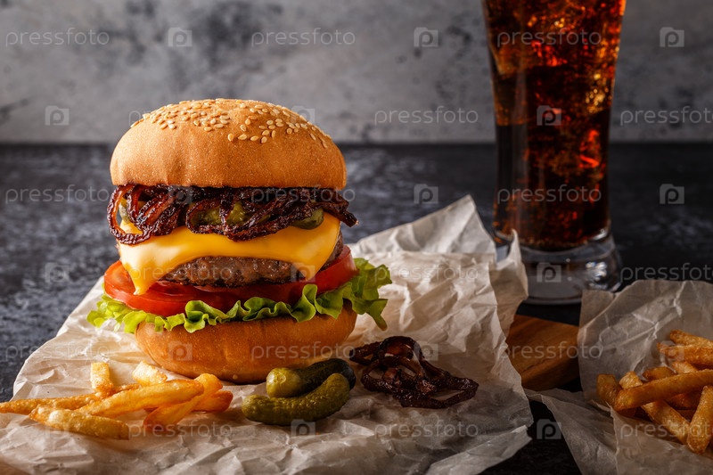 Бургер, гамбургер с картофелем фри и свежими овощами