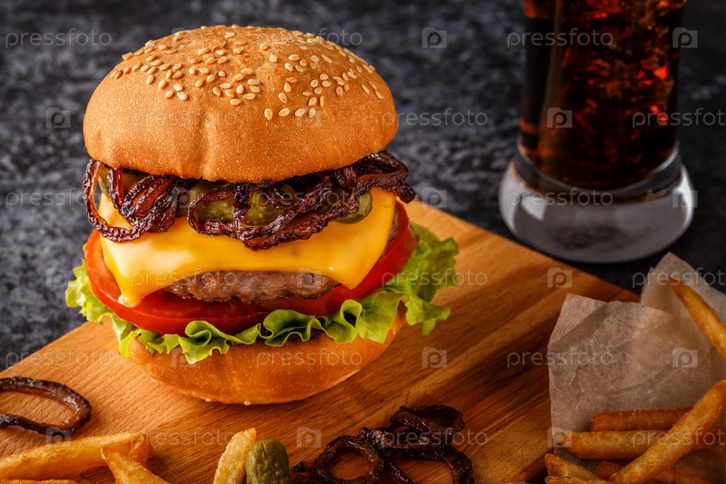 Бургер, гамбургер с картофелем фри и свежими овощами