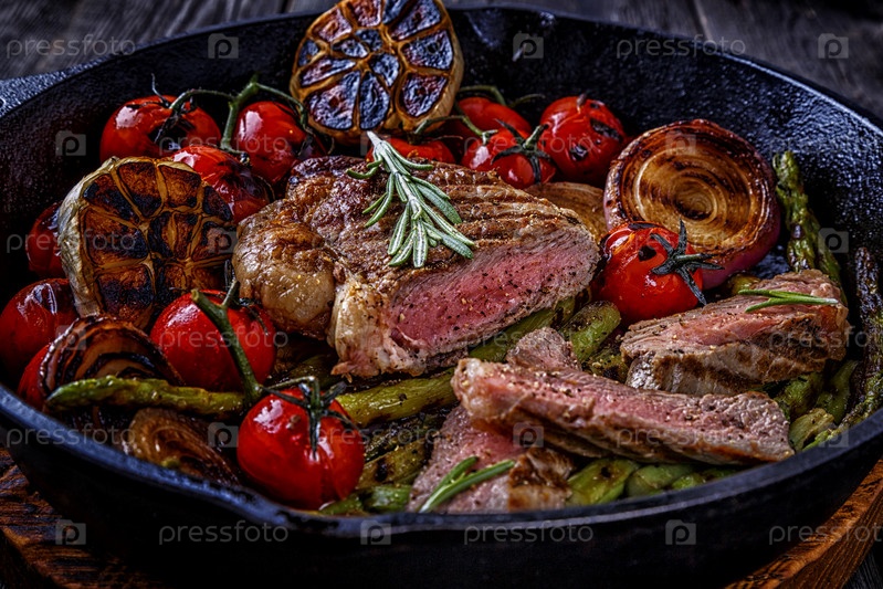 Стейк с овощами гриль на сковороде