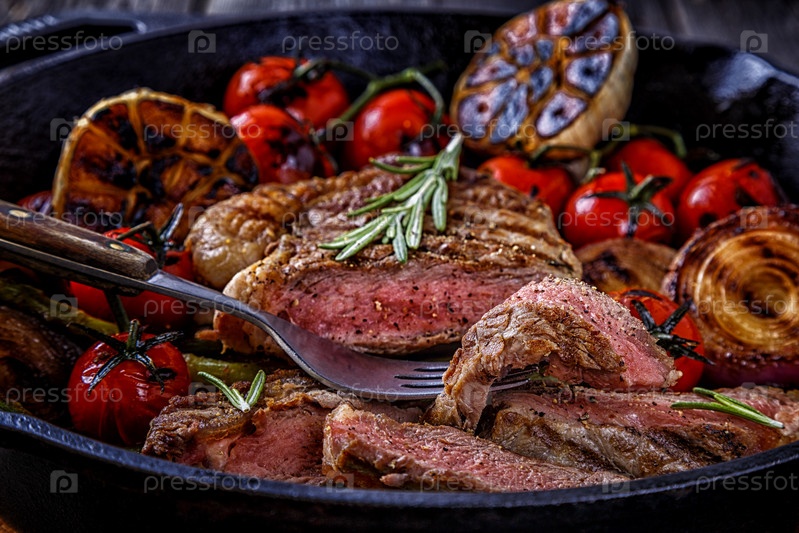 Стейк с овощами гриль на сковороде