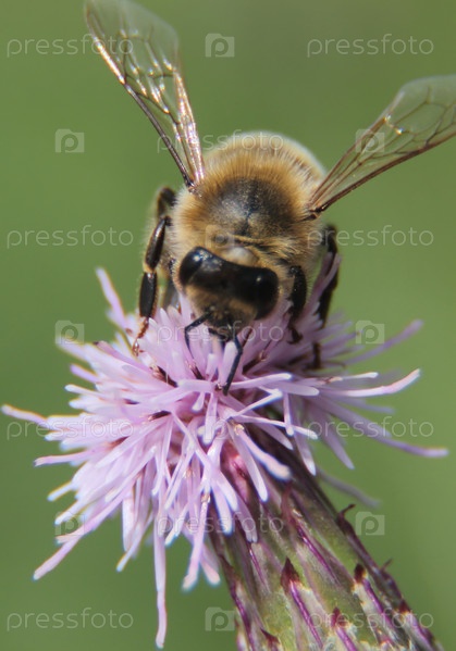 Макросъемка пчела на цветке лопуха