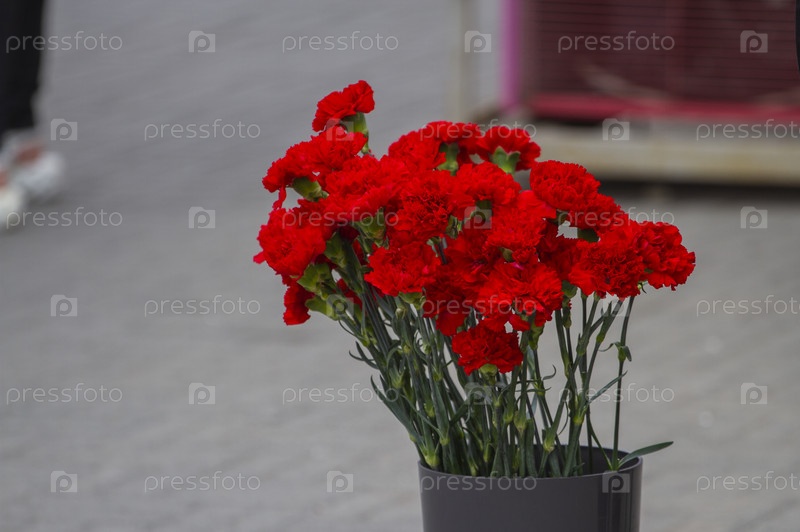 Красные гвоздики в ведре у торговца цветами на городской улице