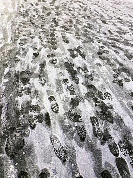 Следы людей на снегу, вертикальное фото