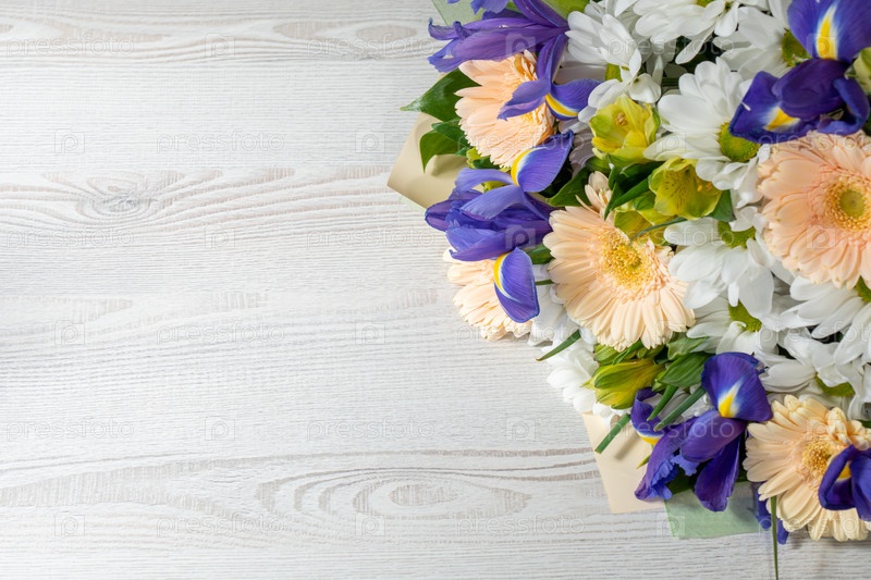 Красочный букет из разных свежих цветов на деревянном фоне. Фон с копией пространства, вид сверху