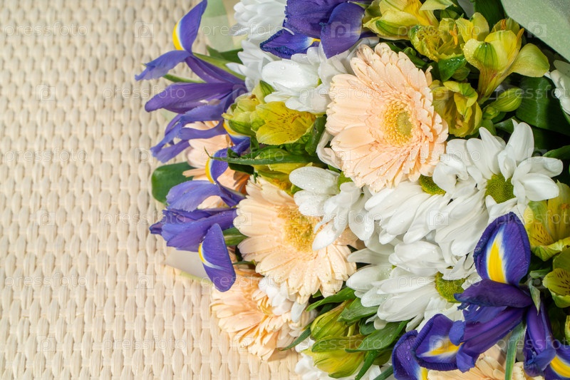 Красочный букет из разных свежих цветов на деревянном фоне. Фон с копией пространства, вид сверху