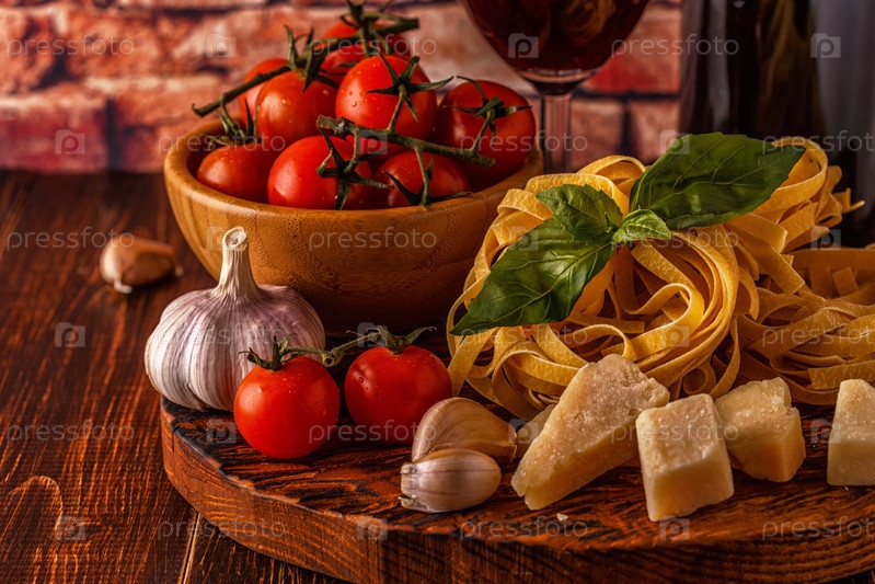 Продукты для приготовления пищи - макароны, помидоры, чеснок, оливковое масло и красное вино