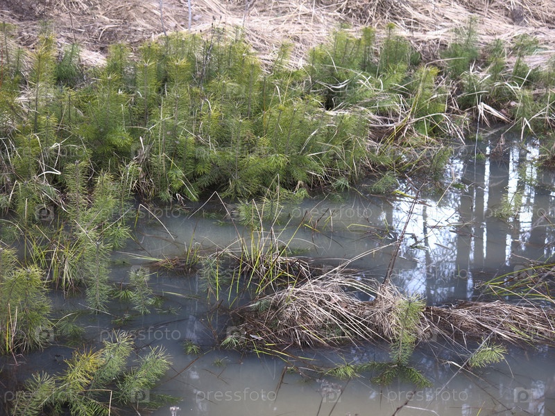 Маленькие ростки елей прорастают весной в затопленном болоте