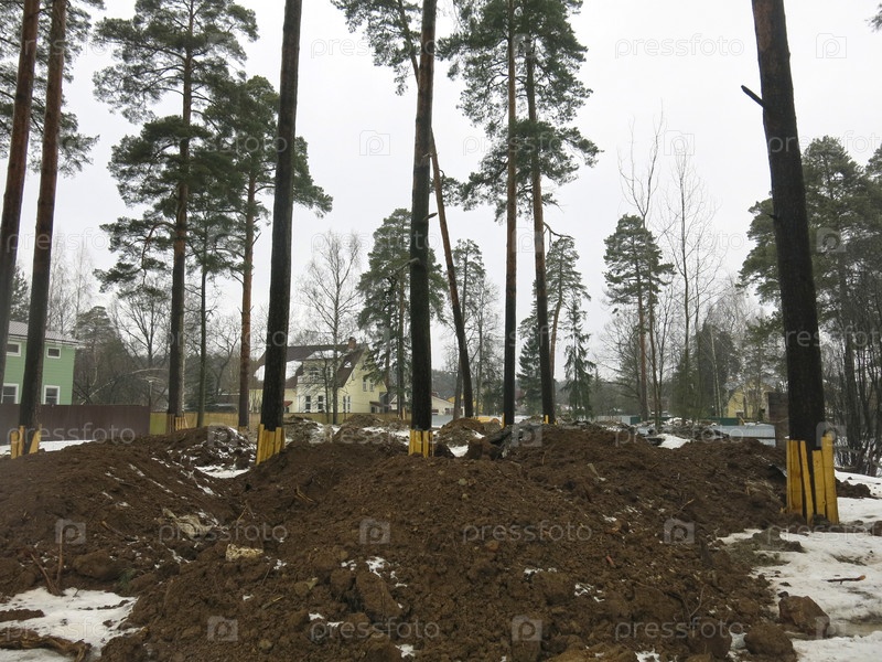 На участке ведется строительство, сосны огорожены желтыми досками, есть куча глины
