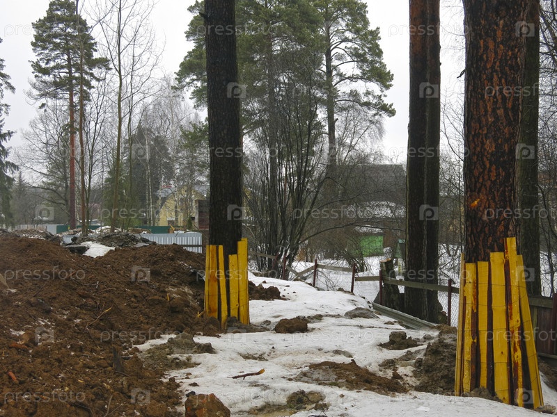 На участке ведется строительство, сосны огорожены желтыми досками, есть куча глины
