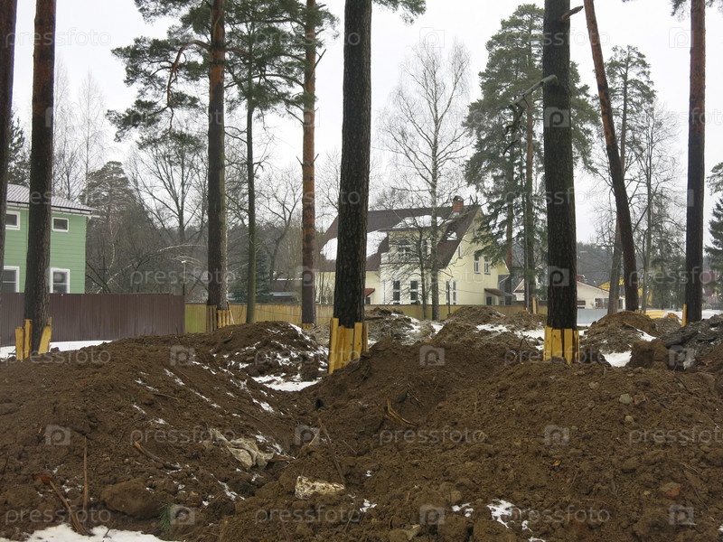 На участке ведется строительство, сосны огорожены желтыми досками, есть куча глины