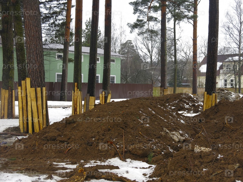 На участке ведется строительство, сосны огорожены желтыми досками, есть куча глины