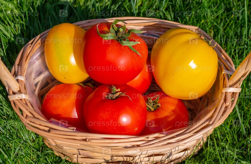 Зрелые крупные красные и желтые сортовые помидоры на траве