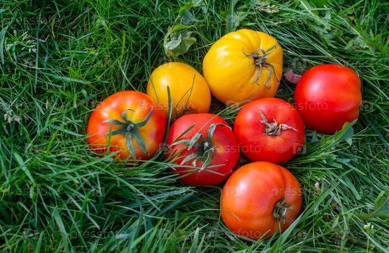 Зрелые крупные красные и желтые сортовые помидоры на траве