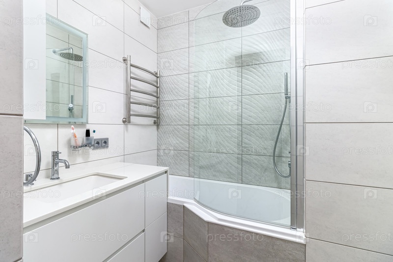 Современная ванная комната в белой мойке и ванной, и большая душевая кабина