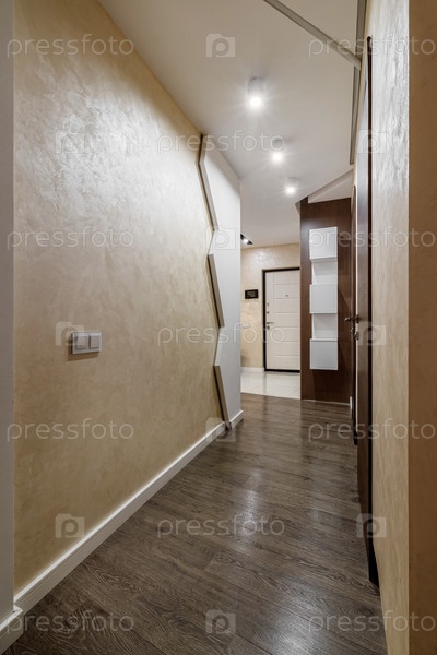 Длинный коридор с межкомнатными дверями в обычной маленькой квартире