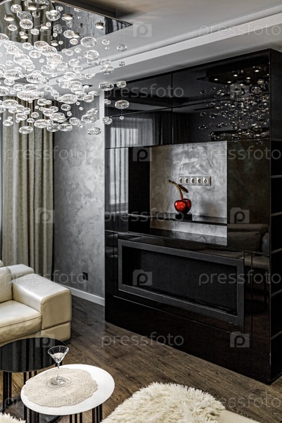 Черный биокамин в гостиной с большой хрустальной люстрой в квартире