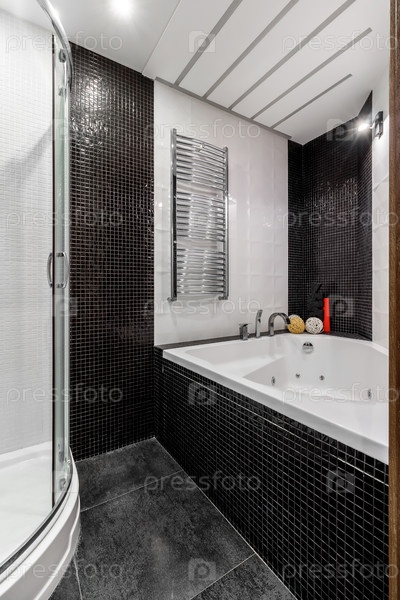 Ванная комната с душем и большой ванной-джакузи с контрастными белыми и черными стенами