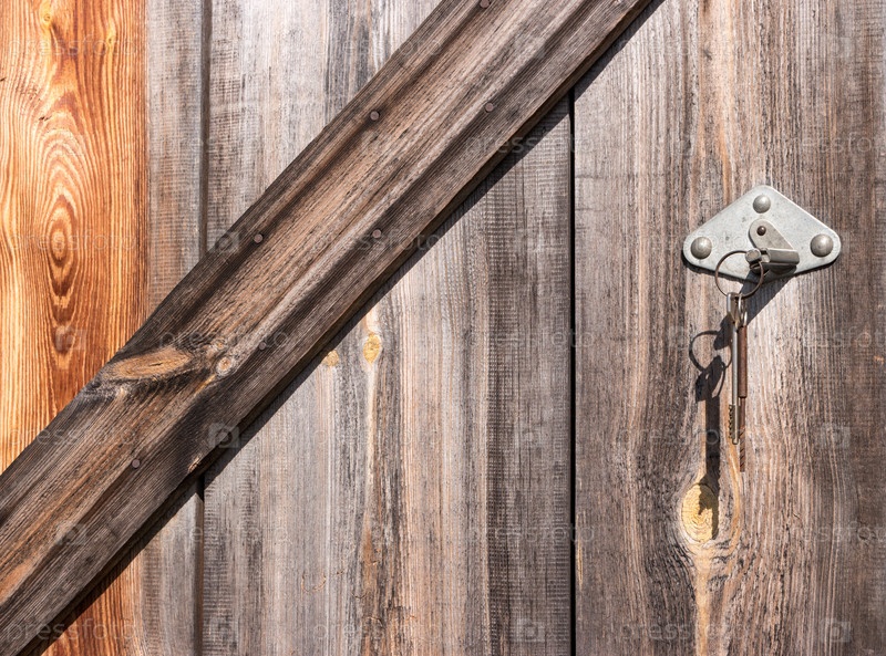 Замок с ключом в старом сарае. Фон с текстурой дерева