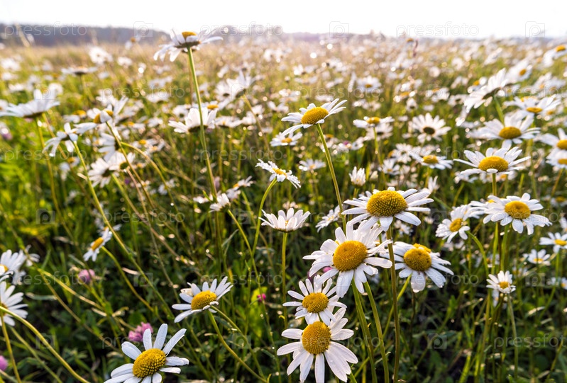 Ромашка на фоне пастбища на закате. Белые бутоны маргариток на зеленом летнем лугу после дождя. Ромашки на русском поле