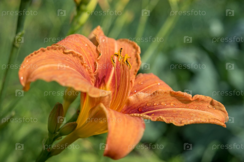 Лилейник крупным планом при дневном свете. Капли на лепестках после дождя. Размытый фон