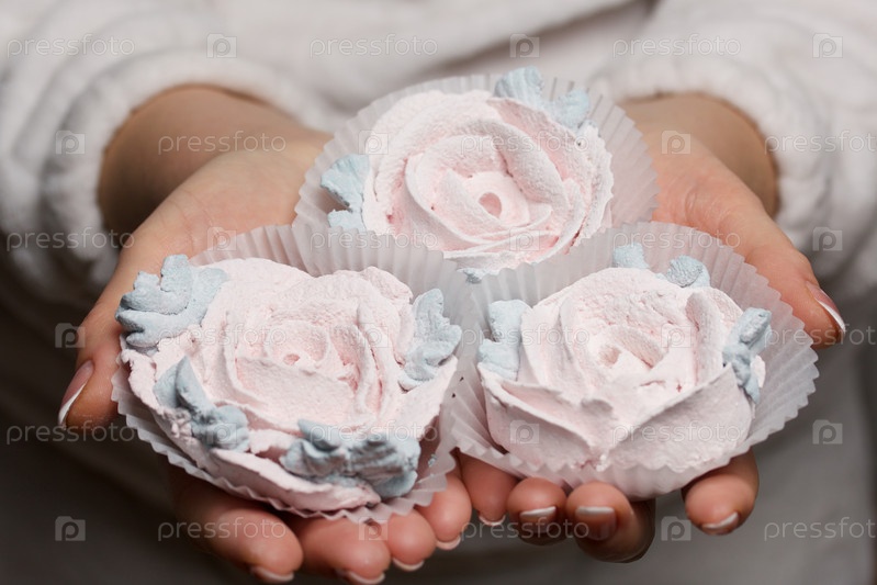 Женщина держит в руках домашний зефир. Зефир цветы. Крупный план