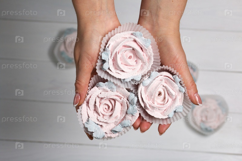 Женщина держит в руках домашний зефир. Зефир цветы. Крупный план
