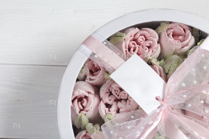 Домашний зефир в картонной коробке. Зефир цветы. Коробка с прозрачной крышкой. Подарочная упаковка. Перевязан лентой. Метка для текста
