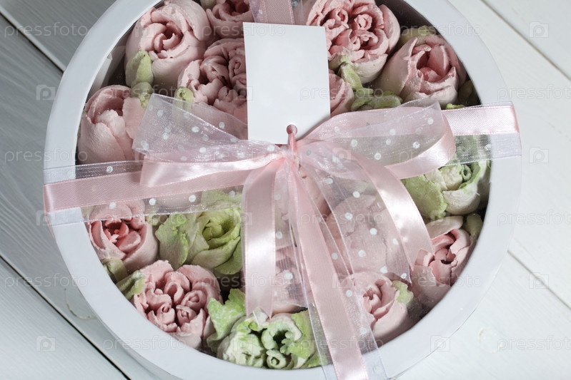 Домашний зефир в картонной коробке. Зефир цветы. Коробка с прозрачной крышкой. Подарочная упаковка. Перевязан лентой. Метка для текста