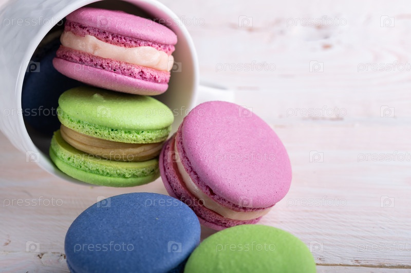 Красочные миндальные печенье разбиваются из белой чаши на светлом деревянном столе, copyspace