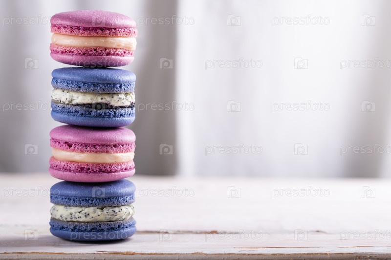 Башня, стопка розового и голубого миндального печенья на светлом фоне крупным планом